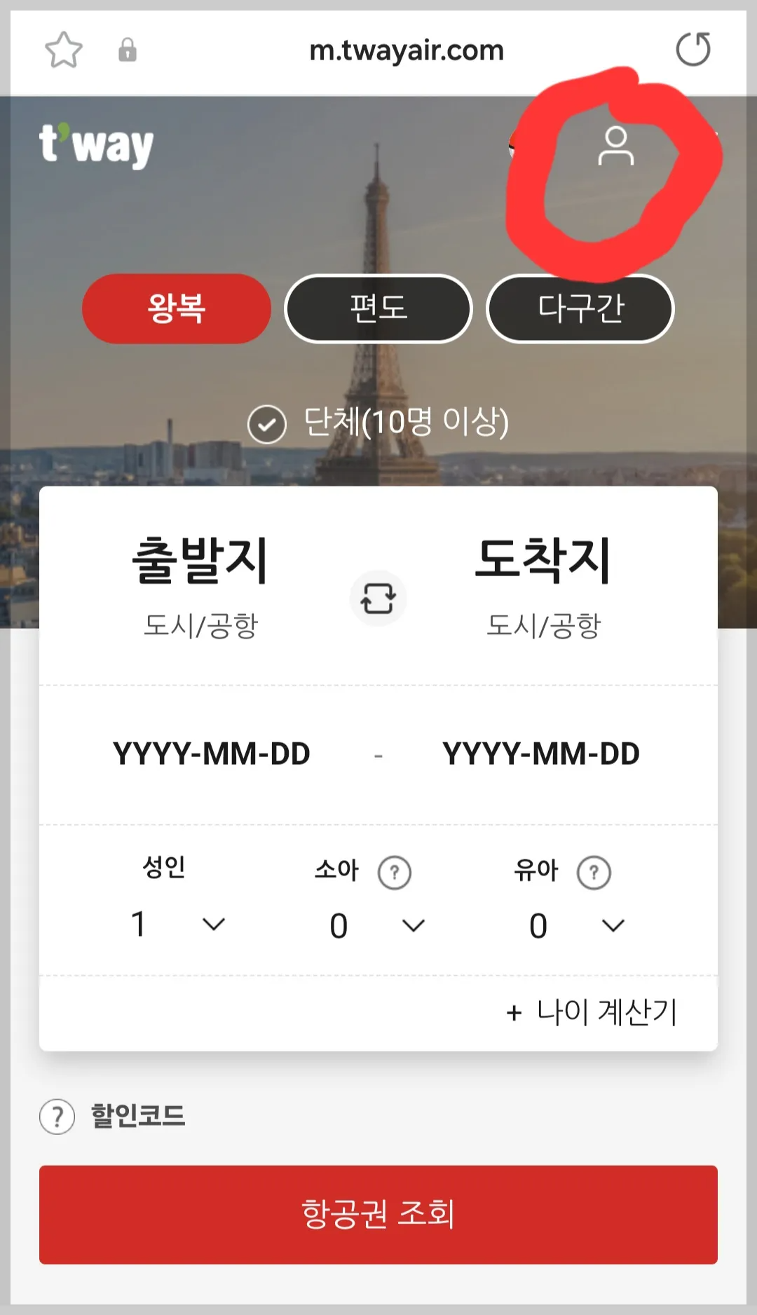 - 먼저 티웨이 계정을 만들어 로그인하세요. 비회원으로는 할인 적용이 어렵습니다.
